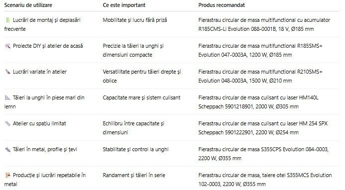 Pentru proiecte de atelier, alegerea depinde de material și frecvența utilizării. Modelele multifuncționale precum R185SMS+ Evolution 047-0003A și R210SMS+ Evolution 048-0003A sunt potrivite pentru utilizare generală, în timp ce modelele culisante Scheppach sunt recomandate pentru piese mari și tăieri repetabile. Pentru metal, modelele S355CPS și S355MCS Evolution oferă control și stabilitate superioară în tăieri la unghi.
