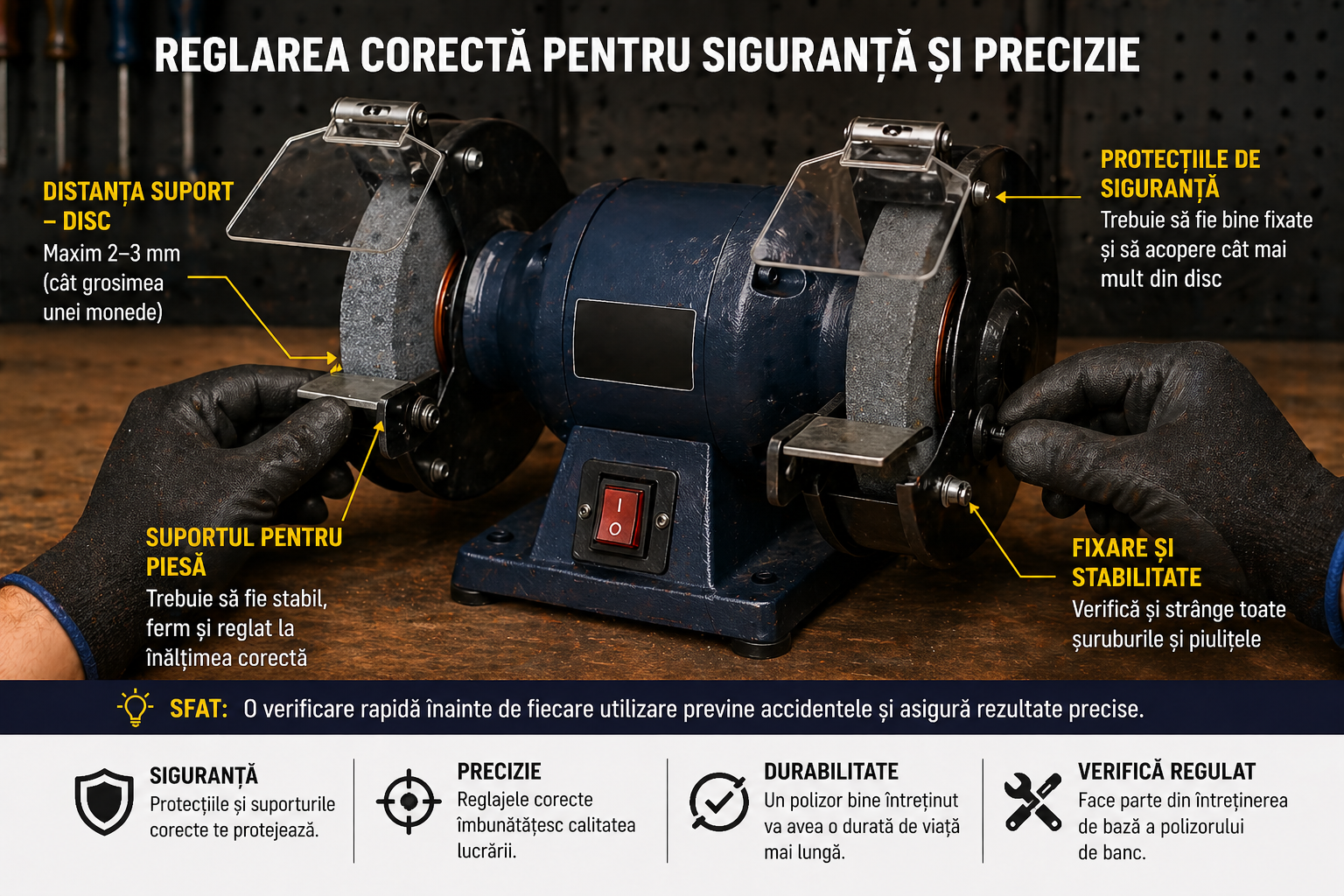 Un polizor de banc este o unealtă robustă, construită pentru utilizare intensivă. Totuși, fără întreținere corectă, performanța sa poate scădea rapid, iar riscurile de utilizare cresc semnificativ.