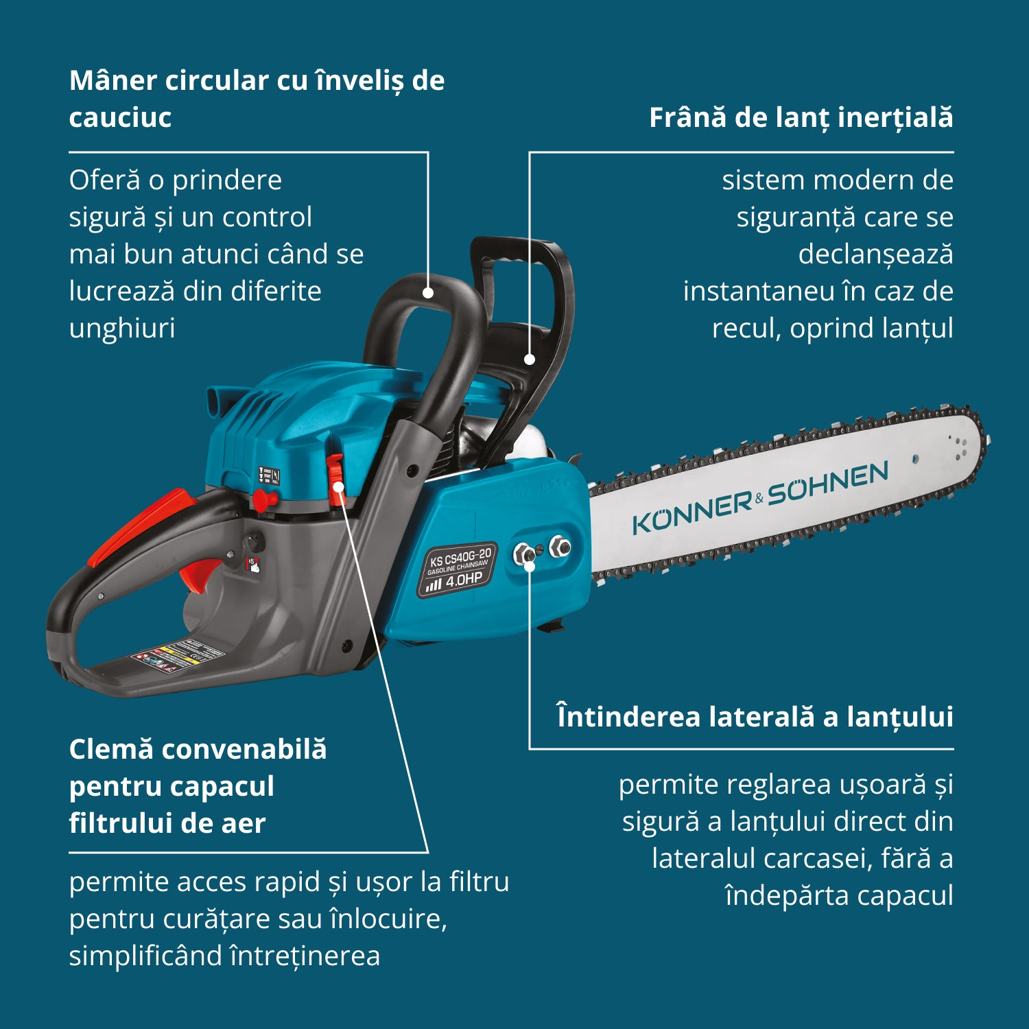 Drujba pe benzină KS CS40G-20 de la marca germană Könner & Söhnen® combină puterea profesională de tăiere, siguranța și confortul în utilizare. Motorul de 65 cm³ / 4,0 CP și șina de 20" (50 cm) permit gestionarea cu ușurință a lemnului de esență tare, curățarea după furtuni și sarcini agricole. Spre deosebire de modelele bugetare, această drujbă are sisteme de siguranță avansate, mânere antivibrații și sistem de pornire rapidă pentru o utilizare fără probleme. Ungerea automată, tensionarea laterală a lanțului și fiabilitatea ingineriei germane o fac o alegere durabilă și ușor de întreținut pentru proprietarii de case, fermieri și cei care au nevoie de echipamente fiabile la un preț corect.