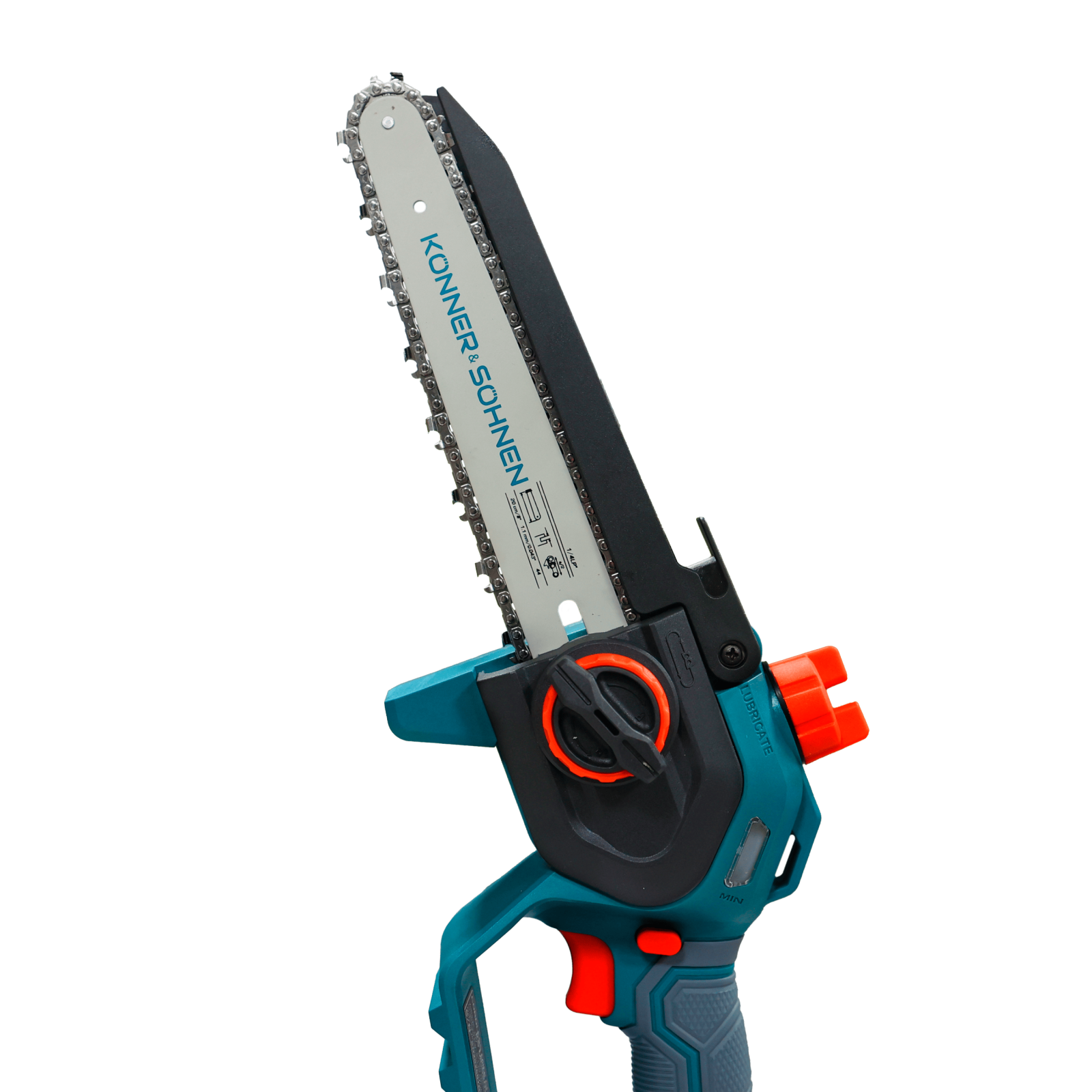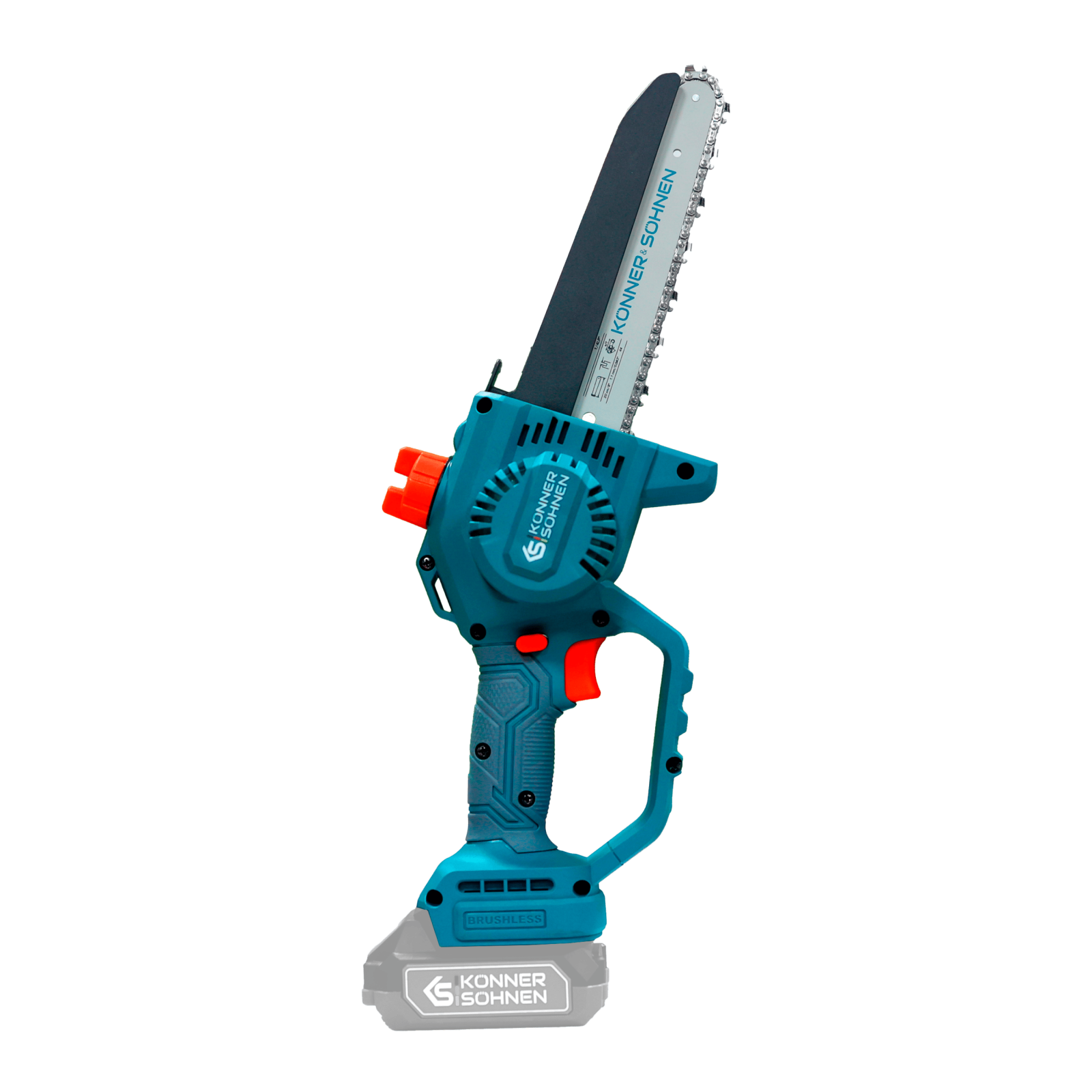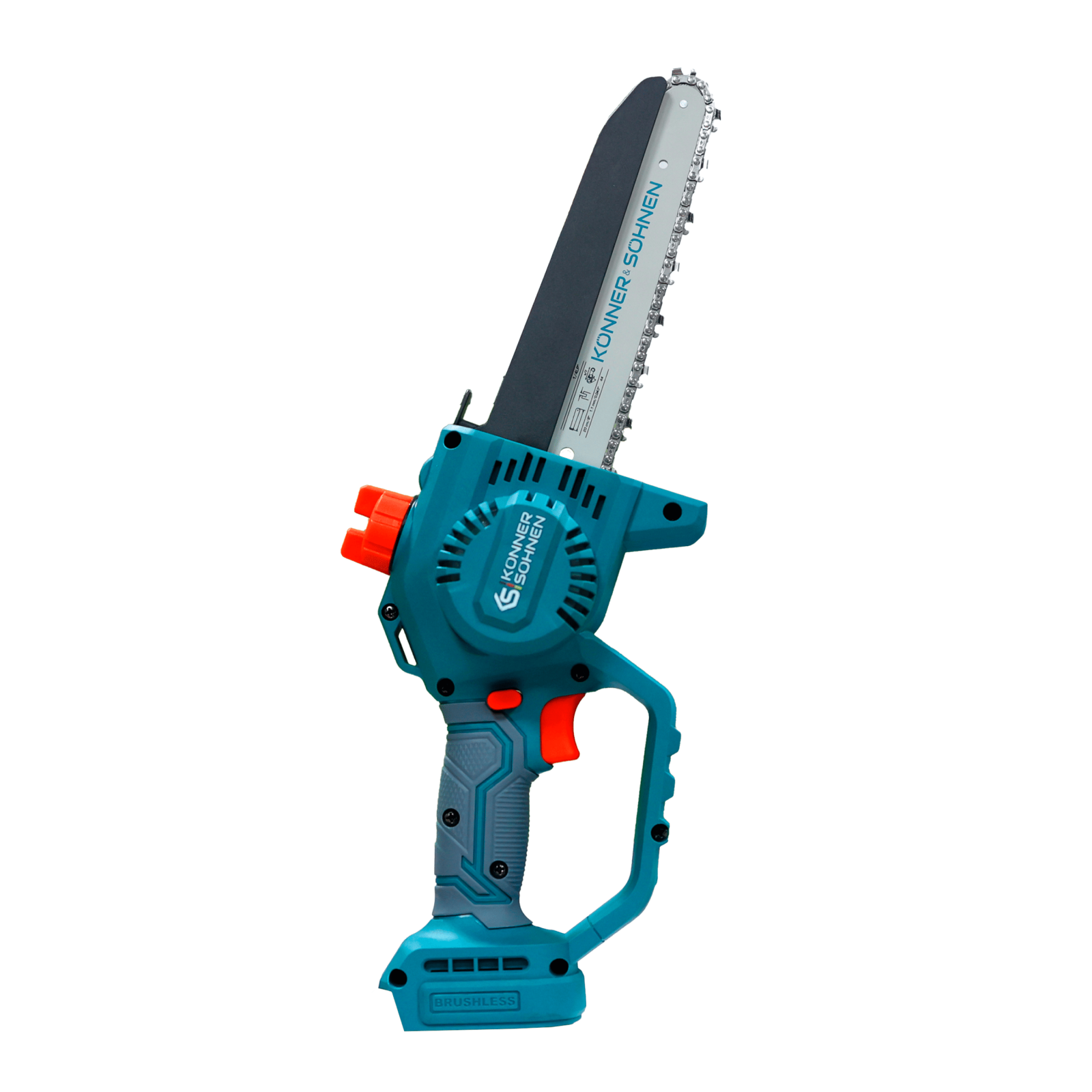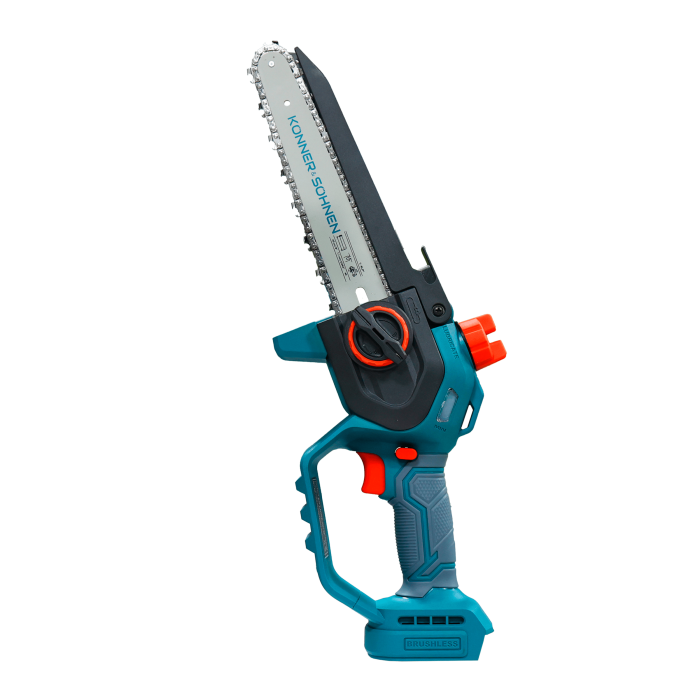 Ferăstrăul cu acumulator KS MCS20V-8 (fără baterie și încărcător) marca Könner & Söhnen, cu lamă de 8″ (20 cm) și viteză a lanțului de 8 m/s, este un instrument fiabil pentru lucrările din grădină. Motorul puternic fără perii, cu garanție de 5 ani, funcționează silențios, durabil și stabil. Corpul compact și mânerul ergonomic din cauciuc oferă confort și control, chiar și cu o singură mână. Pentru siguranță sunt prevăzute un buton de siguranță, protecții și apărătoare, iar pentru comoditate – tensionarea rapidă a lanțului fără unelte, lubrifierea automată a lanțului și o fereastră pentru verificarea nivelului de ulei.
