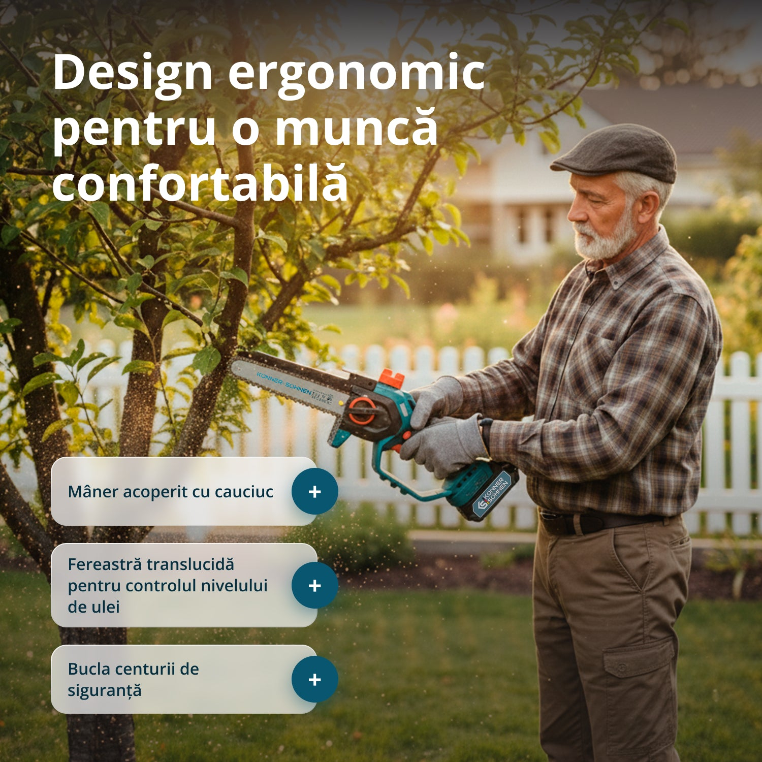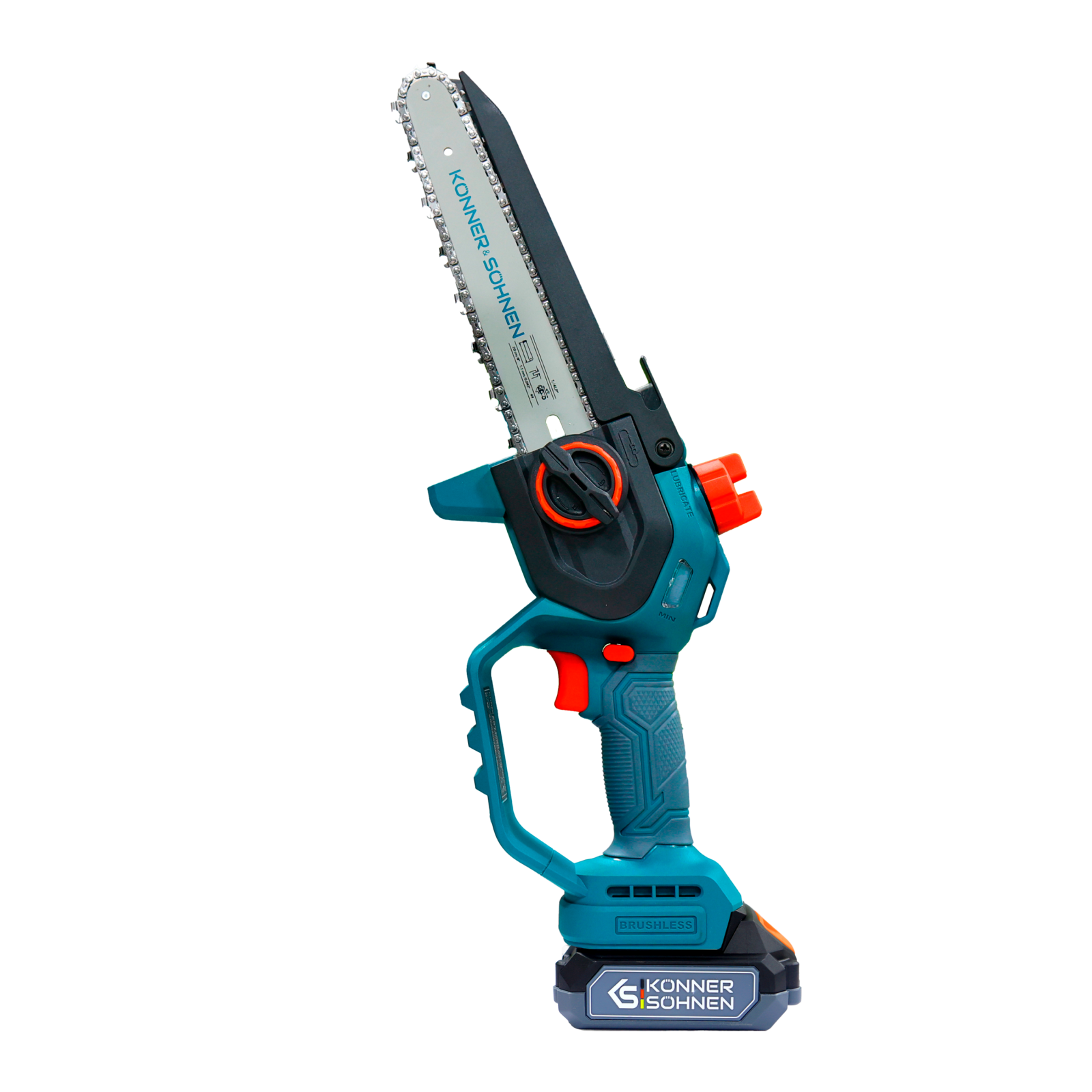 Fierăstrăul mini cu acumulator KS MCS20V-8 Case, de la marca germană Könner & Söhnen, cu lamă de 8" (20 cm) și viteză a lanțului de 8 m/s, este un instrument puternic și silențios pentru grădină. Motorul fără perii, cu garanție de 5 ani, oferă funcționare fiabilă. Fierăstrăul funcționează cu un acumulator de 20V, inclus în set împreună cu încărcătorul, 2 lame și 2 lanțuri. Mânerul ergonomic, apărătoarea de protecție, butonul de siguranță și capacul superior asigură o utilizare sigură. Sistemul de tensionare rapidă a lanțului și lubrifierea automată simplifică întreținerea. Bucle pentru curea de siguranță permit lucrul la înălțime. Ideal pentru tăierea ramurilor și îngrijirea arborilor.
