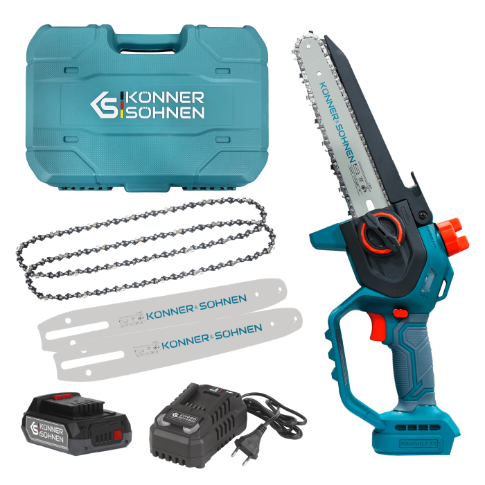 Fierăstrăul mini cu acumulator KS MCS20V-8 Case, de la marca germană Könner & Söhnen, cu lamă de 8” (20 cm) și viteză a lanțului de 8 m/s, este un instrument puternic și silențios pentru grădină. Motorul fără perii, cu garanție de 5 ani, oferă funcționare fiabilă. Fierăstrăul funcționează cu un acumulator de 20V, inclus în set împreună cu încărcătorul, 2 lame și 2 lanțuri. Mânerul ergonomic, apărătoarea de protecție, butonul de siguranță și capacul superior asigură o utilizare sigură. Sistemul de tensionare rapidă a lanțului și lubrifierea automată simplifică întreținerea. Bucle pentru curea de siguranță permit lucrul la înălțime. Ideal pentru tăierea ramurilor și îngrijirea arborilor.