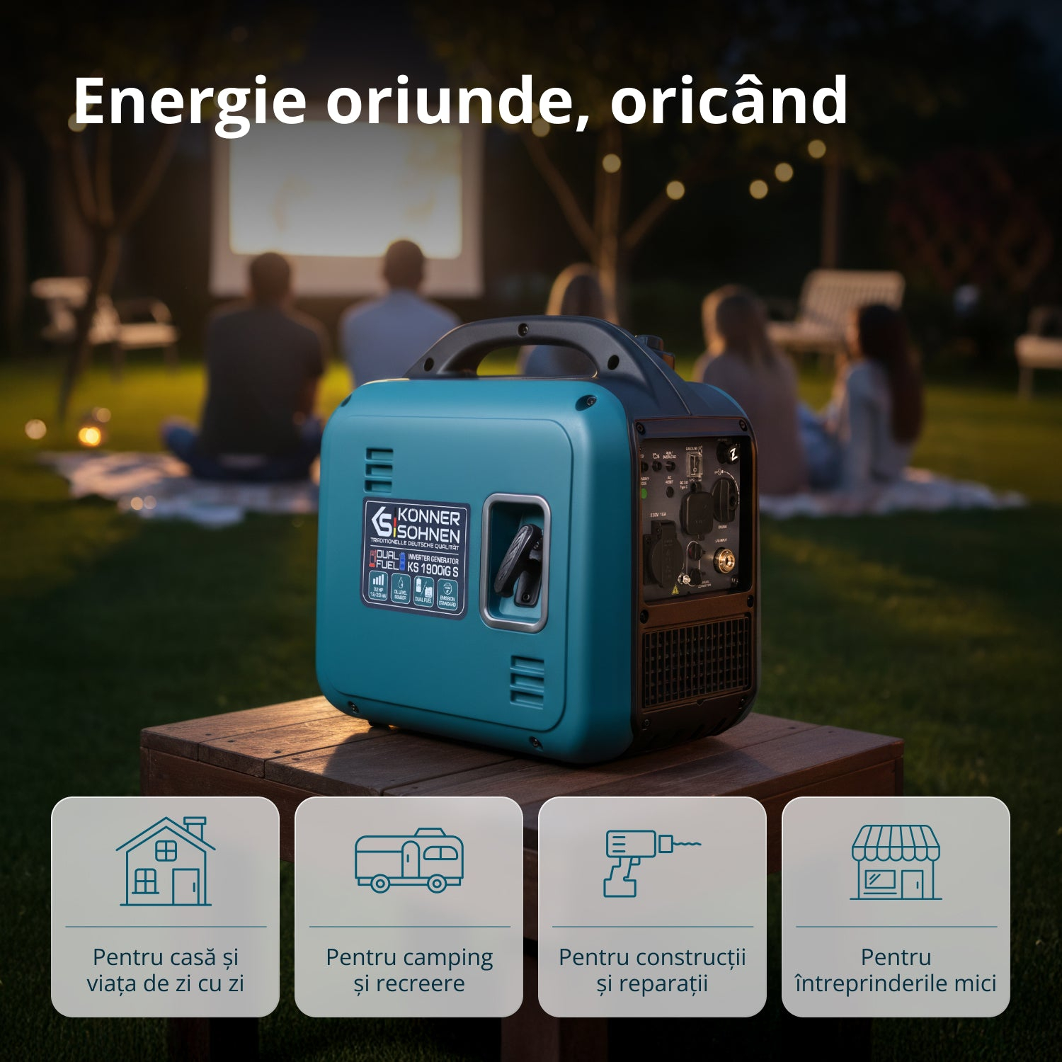 KS 1900iG S este un generator invertor compact cu sistem Dual Fuel, creat pentru nevoile moderne. Cântărește doar 17 kg, ceea ce îl face unul dintre cele mai ușoare din clasa sa și ușor de transportat. Datorită posibilității de a funcționa pe benzină sau gaz, economisești combustibil și obții un timp de funcționare mai mare. Carcasa fonoizolantă asigură o funcționare silențioasă, ideală pentru camping, utilizare acasă sau în autorulotă. Invertorul produce o undă sinusoidală pură, sigură pentru laptopuri, telefoane și electronice sensibile. Cu Eco-Mode, sisteme integrate de siguranță și set complet de accesorii, acest generator oferă o alimentare fiabilă.
