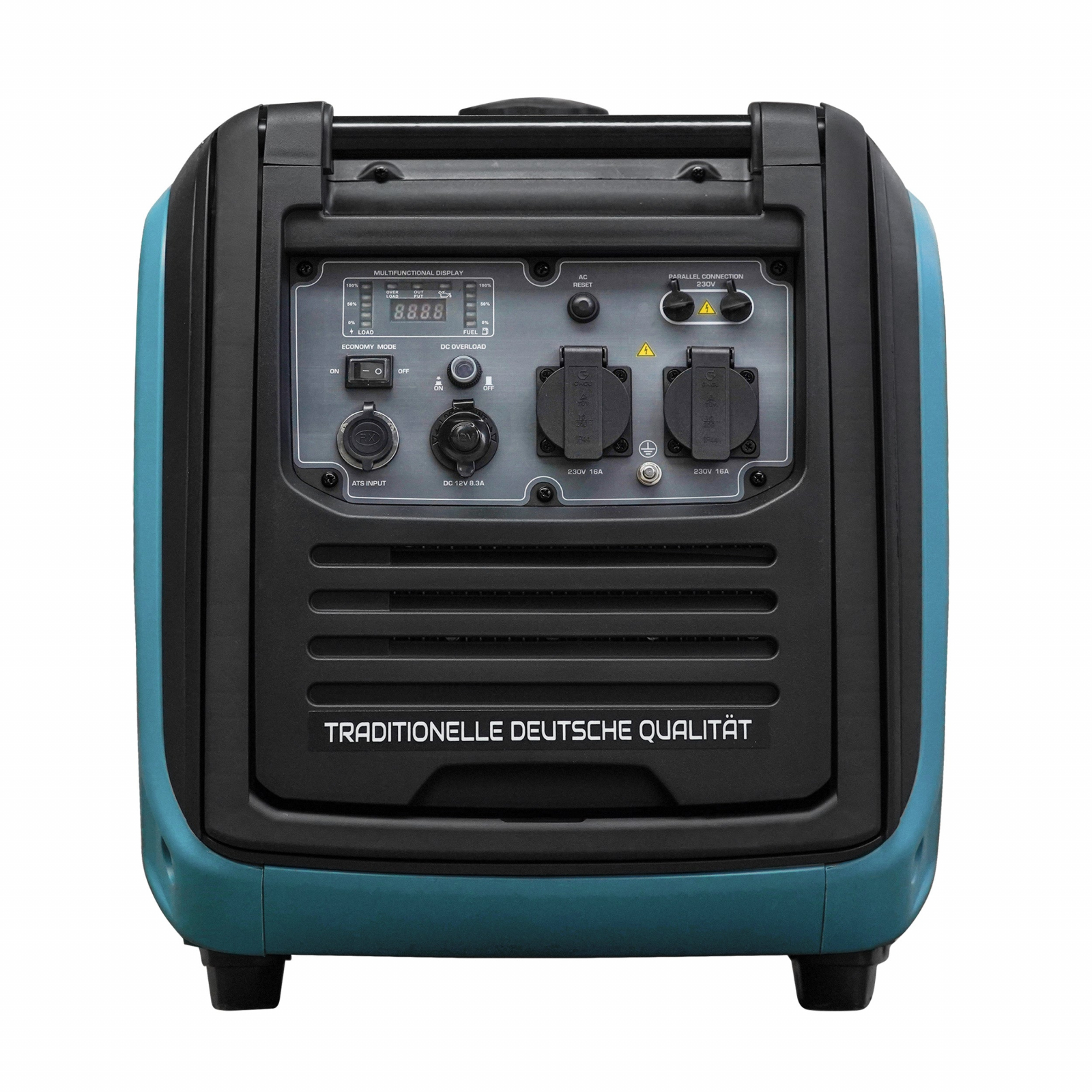 Localizarea convenabilă a tuturor funcțiilor: afișaj LED multifuncțional (contor de ore, frecvență, tensiune), indicator de mod de lucru, protecție la suprasarcină și scurtcircuit, senzor de nivel scăzut al uleiului, buton Reset pentru resetarea sistemului de control și restabilirea alimentării cu tensiune, conector pentru conexiunea paralelă a generatoarelor și terminal de împământare.
