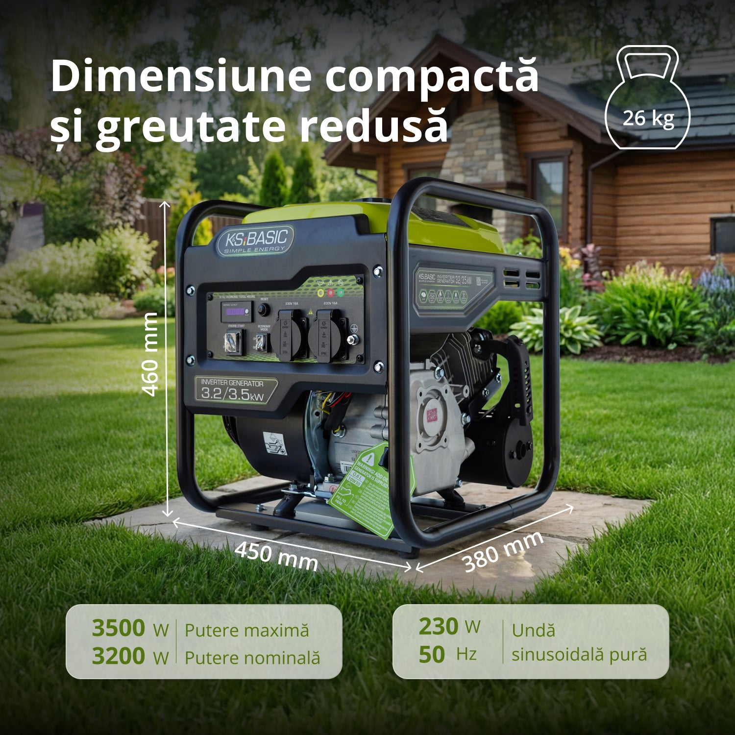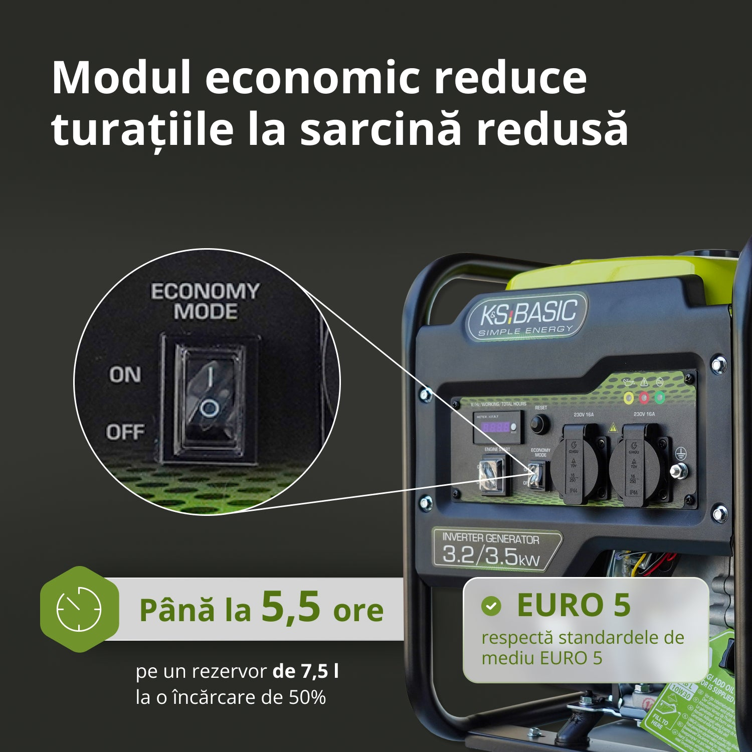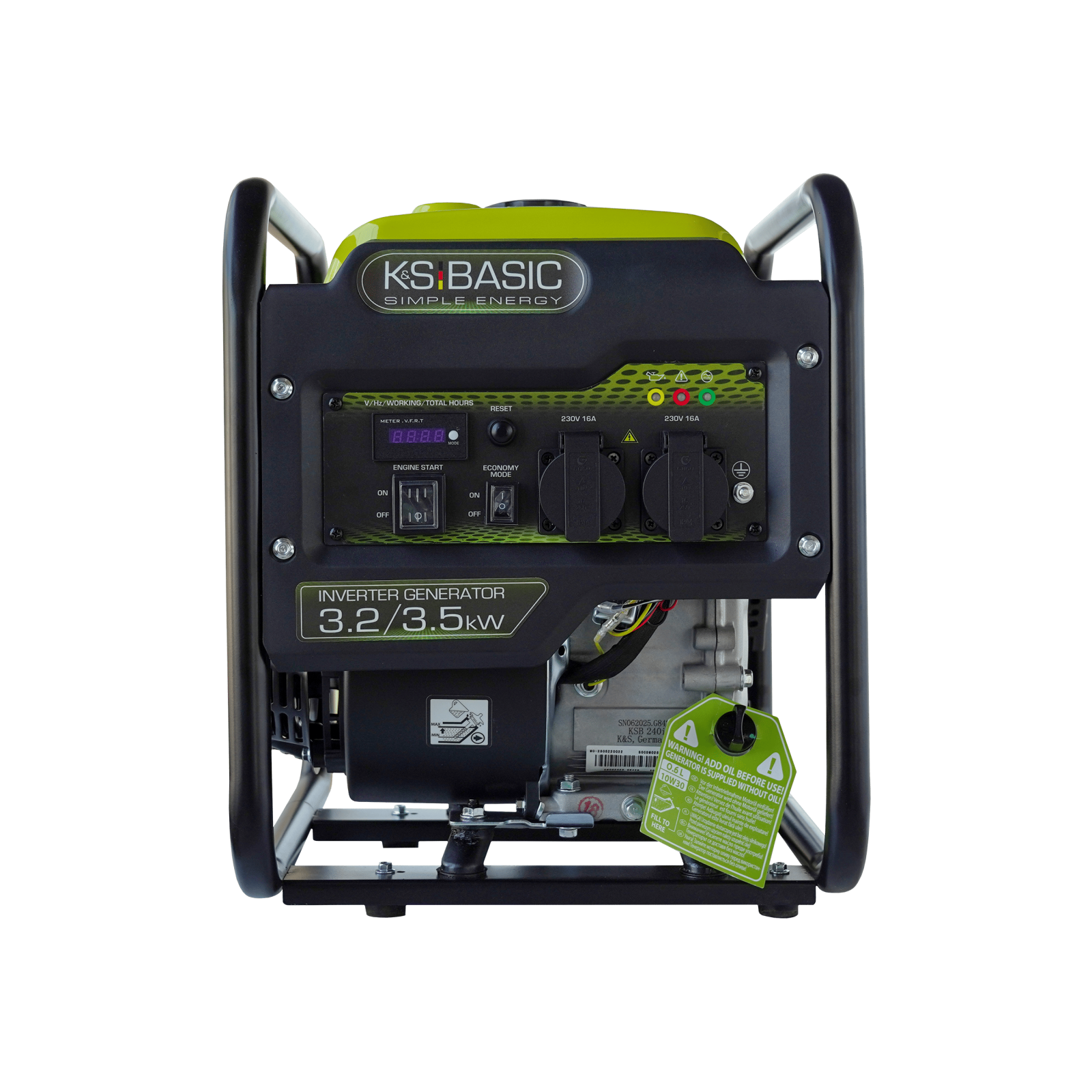 Generatorul invertor KSB 35i de la marca germană Könner & Söhnen® oferă o putere maximă de 3,5 kW și asigură energie stabilă de 230 V 50 Hz. Tehnologia invertorului garantează o undă sinusoidală curată, sigură pentru electronice sensibile. Motorul fiabil K&S respectă standardul EURO 5, iar modul ECONOMY reduce consumul de combustibil. Panoul de control are afișaj LED, prize de 16 A. Alternatorul fără perii, cu înfășurare din cupru, suportă sarcini mari. Dimensiunile compacte și picioarele de sprijin îl fac convenabil și stabil în utilizare.