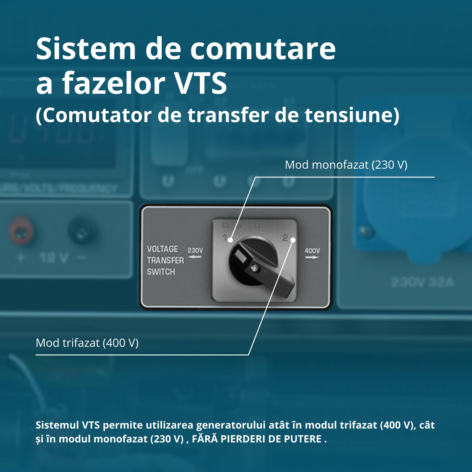 Generatorul este echipat cu sistemul VTS (Voltage Transfer Switch) – un sistem de comutare a tipului de tensiune. Datorită acestui sistem, generatorul poate funcționa atât în regim monofazat (230V), cât și în regim trifazat (400V).