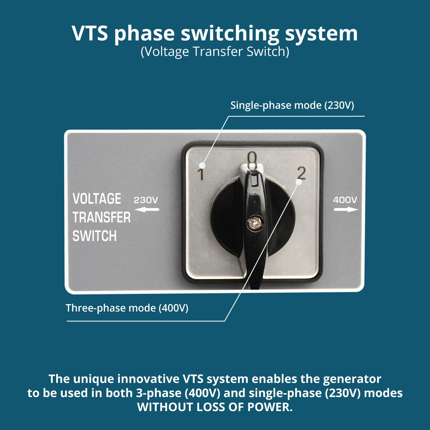 Generatorul este echipat cu sistemul VTS (Voltage Transfer Switch) – un sistem de comutare a tipului de tensiune. Datorită acestui sistem, generatorul poate funcționa atât în regim monofazat (230V), cât și în regim trifazat (400V).