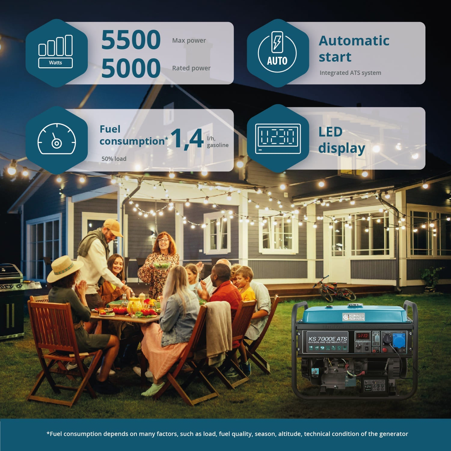 Panoul de control ergonomic al generatorului, dotat cu pornire electrică, permite o operare facilă, fără necesitatea unor cunoștințe suplimentare. Afișajul LED inteligent oferă în permanență informații despre numărul de ore de funcționare, frecvența și tensiunea generată. Aceste date permit monitorizarea eficientă a parametrilor de lucru și efectuarea la timp a întreținerii tehnice, prelungind astfel durata de viață a generatorului.
