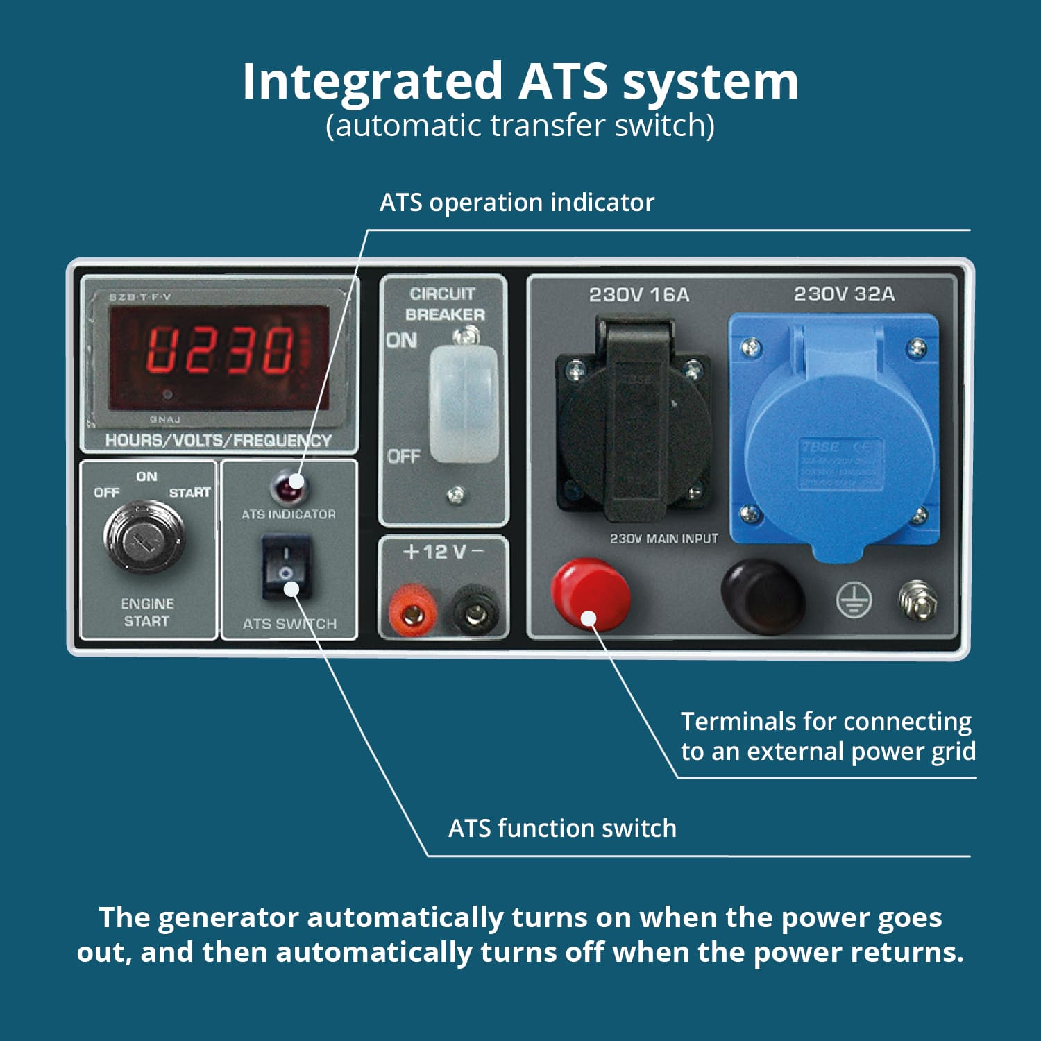 Panoul de control al generatorului cu funcția ATS este echipat cu: borne pentru conectarea la alimentarea electrică, comutator pentru activarea funcției ATS și indicator pentru monitorizarea funcționării ATS.
