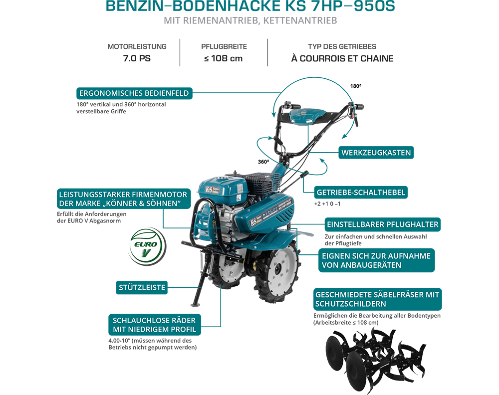 Motoarele cultivatoarelor în patru timpi, performante și eficiente din punct de vedere al consumului de combustibil, de la Könner & Söhnen respectă cele mai recente standarde de emisii EURO V, sunt proiectate pentru funcționare continuă și oferă performanțe ridicate. Modelele de cultivatoare KS 7HP-950A și KS 7HP-950S sunt potrivite pentru a acomoda atașamente suplimentare (plug de bilonat, plug subsolier, săpător de cartofi, potrivite pentru roți pneumatice cu profil înalt).