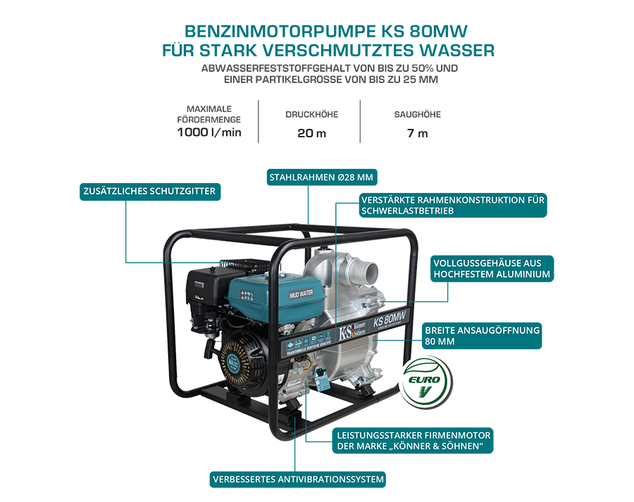 Motoarele proprii utilizate în motopompele „Könner & Söhnen” sunt durabile și economice, fiind fabricate sub supravegherea strictă a inginerilor germani. Motorul fiabil Könner & Söhnen respectă toate standardele europene de calitate, inclusiv standardul ecologic modern EURO V.