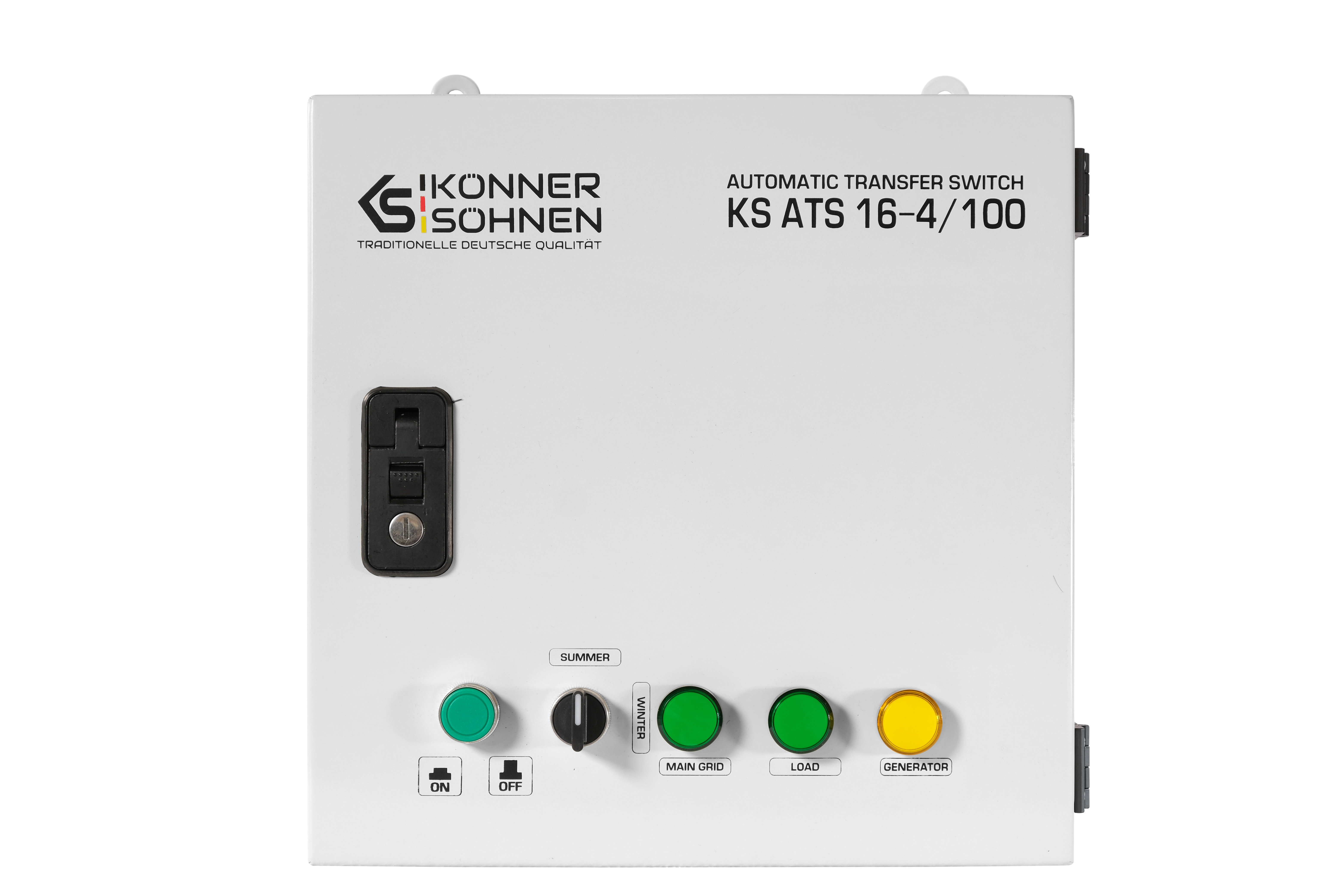 Blocul de transfer automat (ATS) KS ATS 16-4/100 al mărcii germane Könner & Söhnen pornește automat generatorul și comută sarcina pe acesta atunci când sursa principală de alimentare este deconectată și oprește automat generatorul când alimentarea centrală este restabilită.