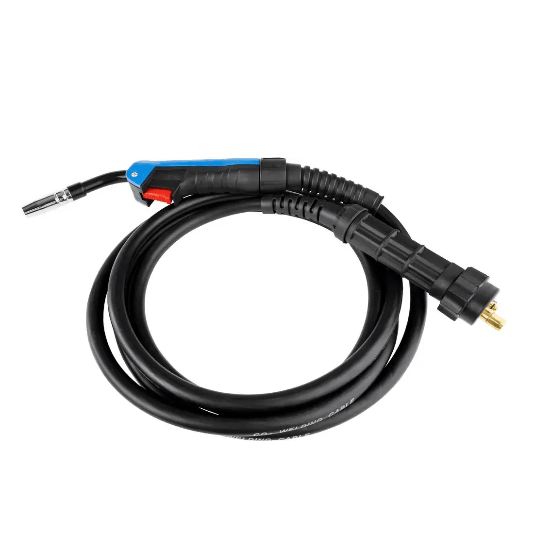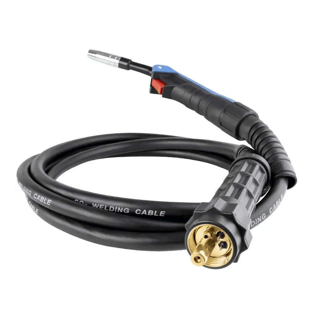 Pentru a preveni deteriorarea cablului in punctele de tensiune, acesta este dotat cu arcuri spirale de protectie impotriva indoirii (anti-kink), atat la baza manerului, cat si la conexiunea centrala. Lungimea generoasa de 4 metri ofera o raza mare de actiune fata de aparatul de sudura, permitandu-ti sa ajungi usor la piese voluminoase fara a muta invertorul. Datorita mufei Euro Standard, pistoletul este universal compatibil cu majoritatea aparatelor de sudura cu gaz protector