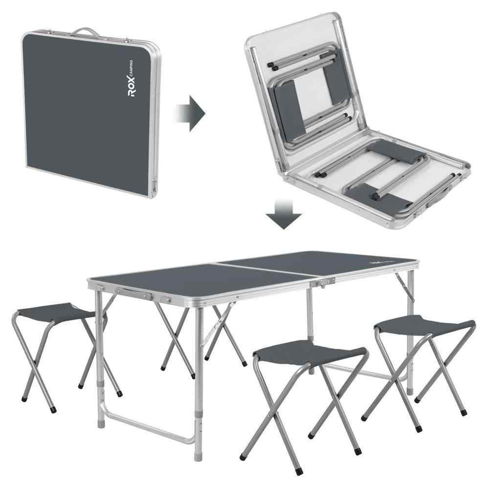 • Acest set de camping este format dintr-o masa si patru scaune. Datorita designului sau practic, setul poate fi pliat, luand forma unei valize. Acest lucru nu numai ca faciliteaza transportul, dar economiseste si spatiul de depozitare. Acest lucru face ca setul sa fie ideal pentru utilizare in bucatarie, pe balcon, in camping sau in parc pentru picnicuri