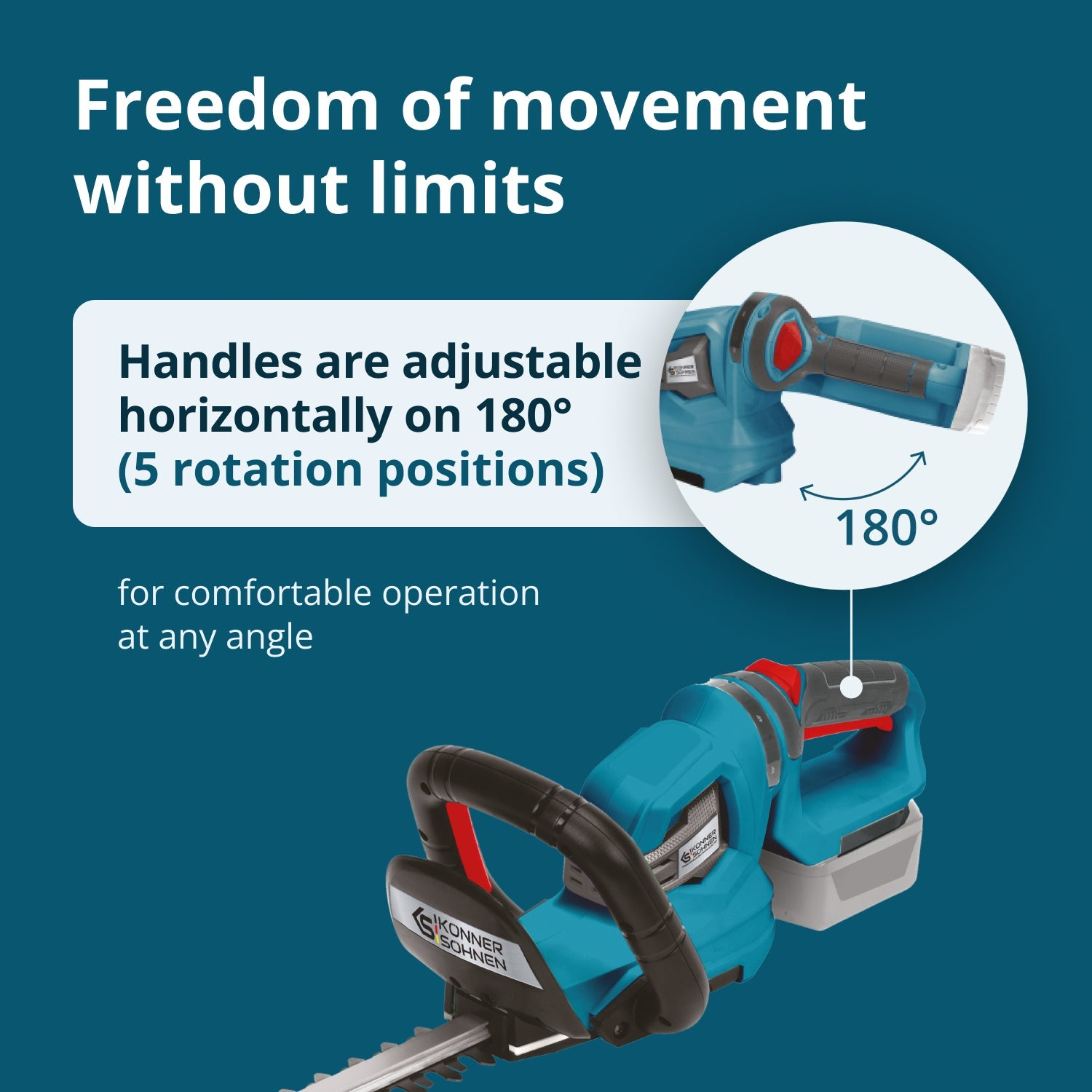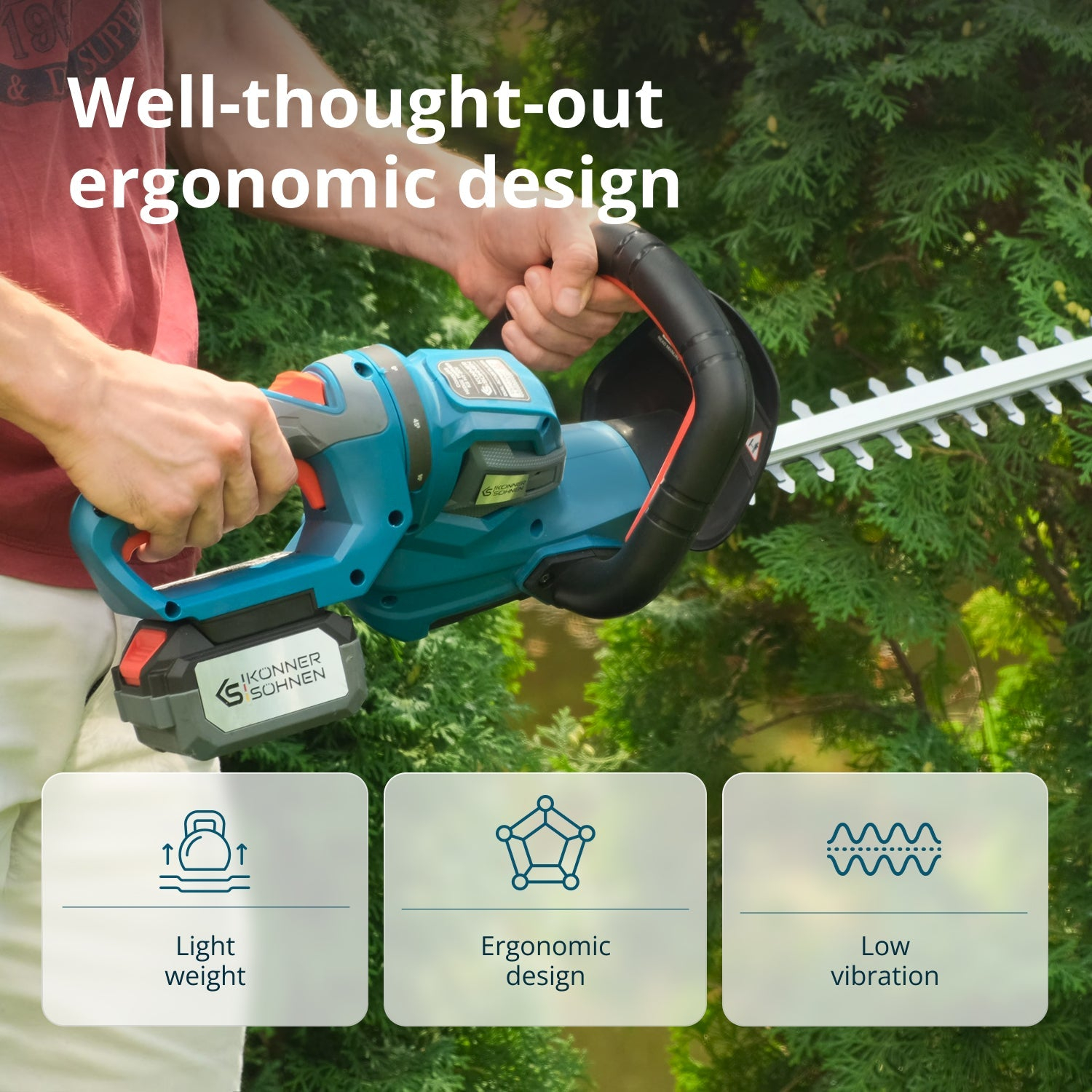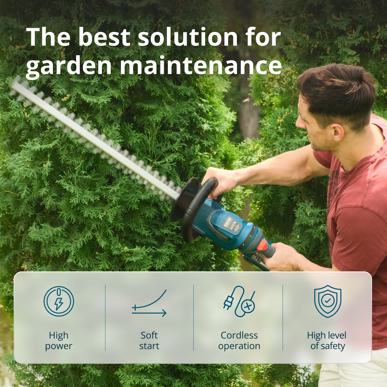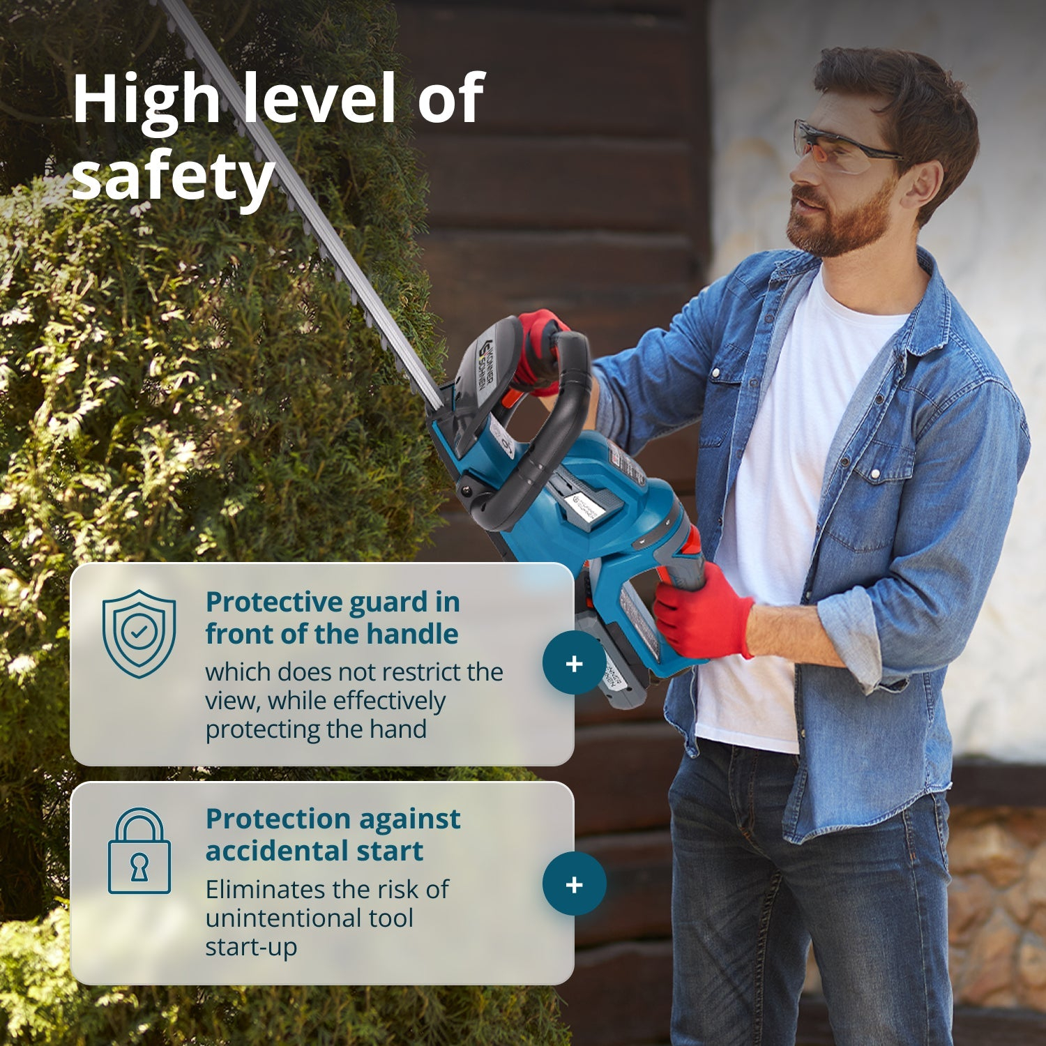 Tăietorul de tufe cu acumulator: Tăietorul de tufe cu acumulator, cu lamă de 55 cm cu șlefuire laser, mâner rotativ la 180°, pornire lină și greutate de 3,5 kg asigură o tăiere precisă și confortabilă a ramurilor de până la 16 mm, mobilitate ridicată fără cabluri, vibrații reduse, siguranță în utilizare și economii datorită sistemului unic de acumulatori.