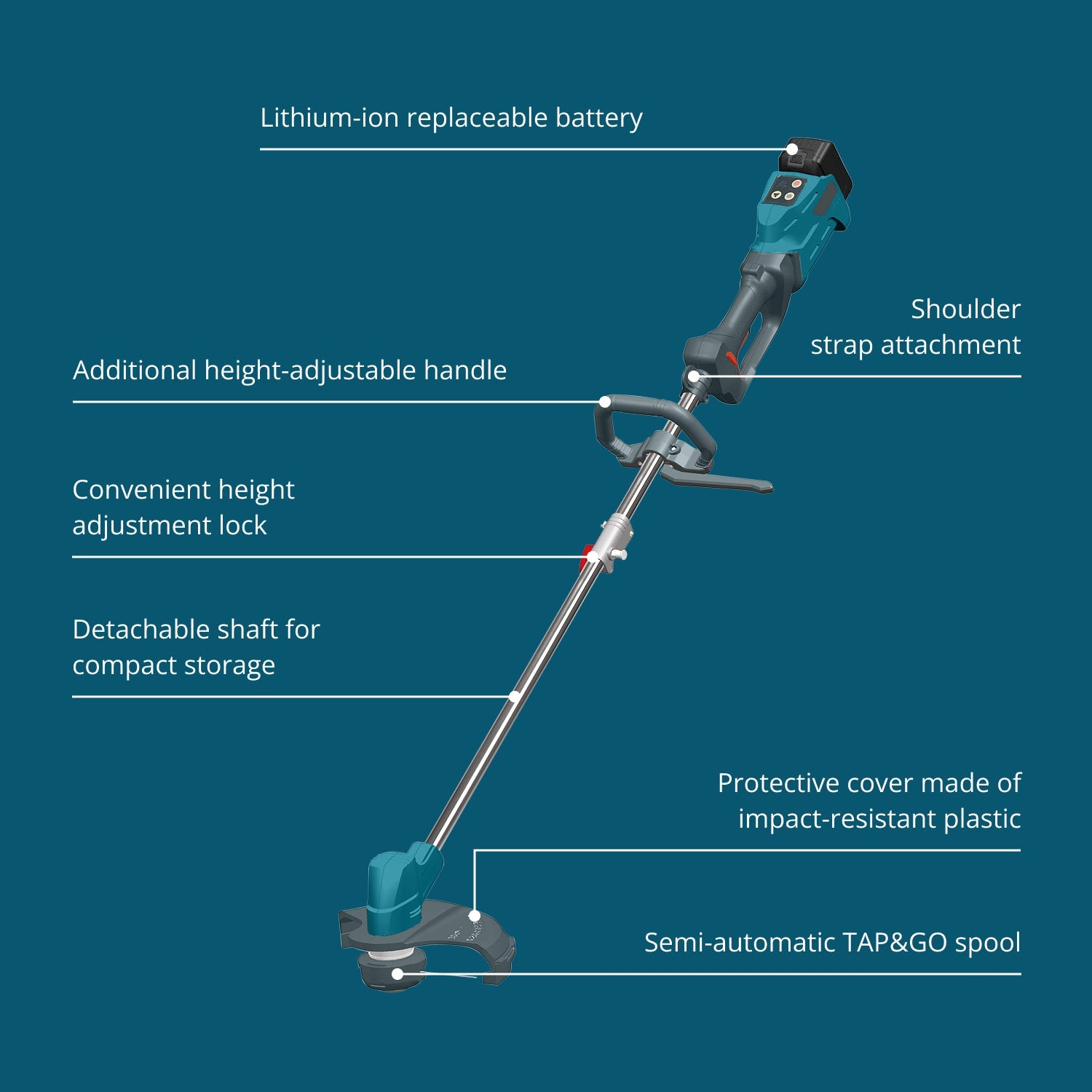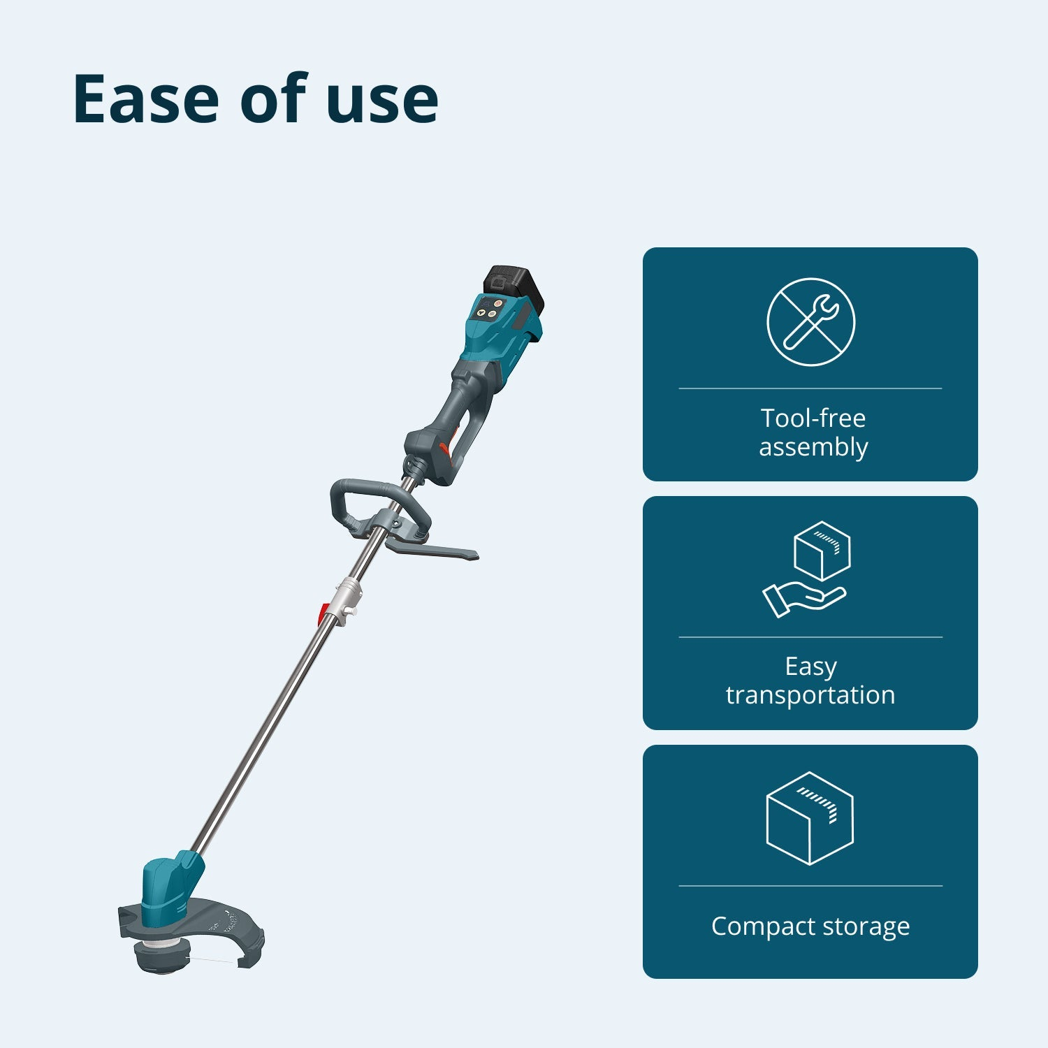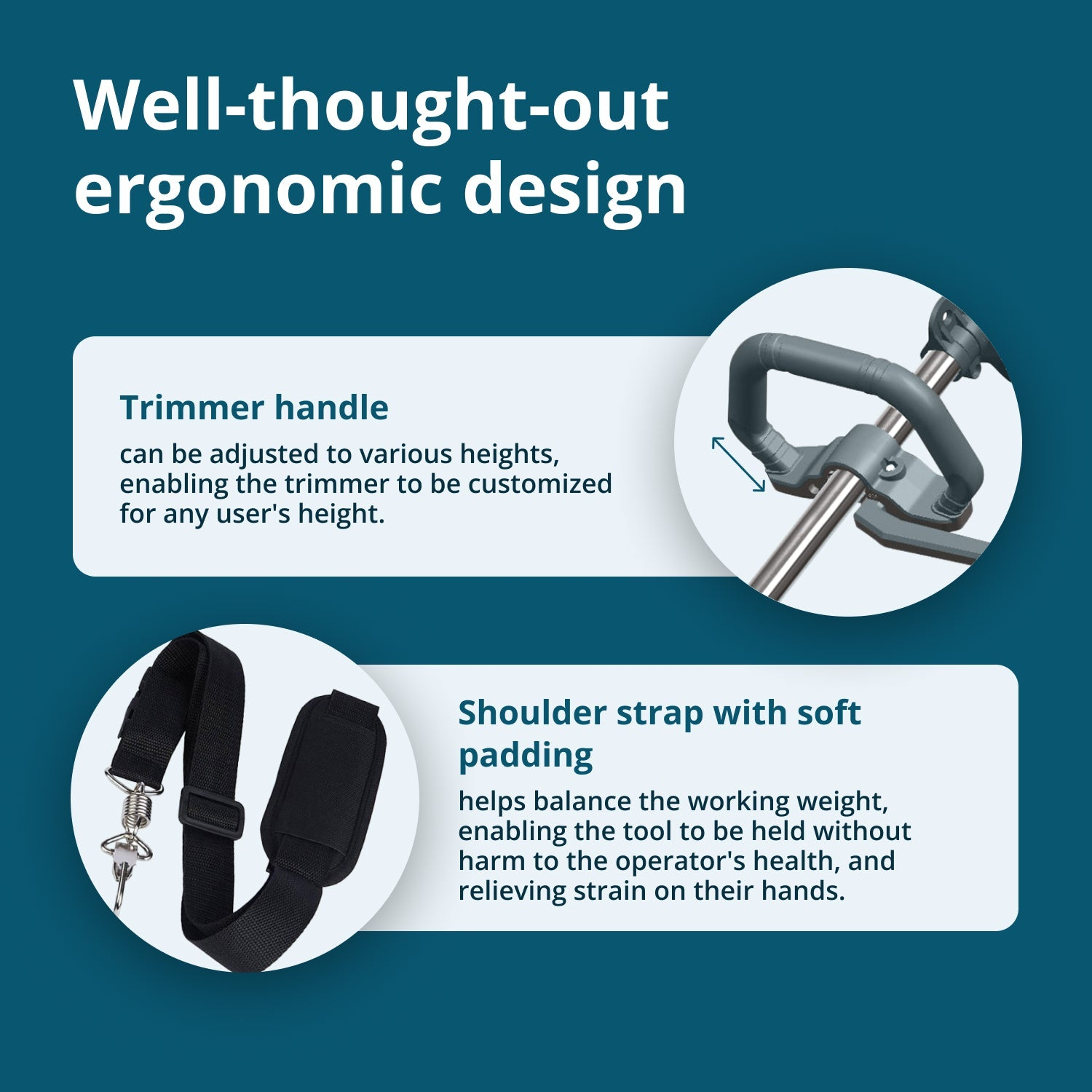 Mânerul trimmerului poate fi reglat la diferite înălțimi, permițând adaptarea acestuia la statura oricărui utilizator. Curea de umăr cu inserție moale ajută la distribuirea echilibrată a greutății, susținând echipamentul fără a afecta sănătatea utilizatorului și reducând efortul asupra mâinilor. În plus, trimmerele se asamblează și se demontează rapid, în doar câteva minute, pentru a facilita transportul și depozitarea compactă. Nu necesită întreținere complexă, datorită absenței amestecurilor de combustibil, filtrelor sau altor componente similare.