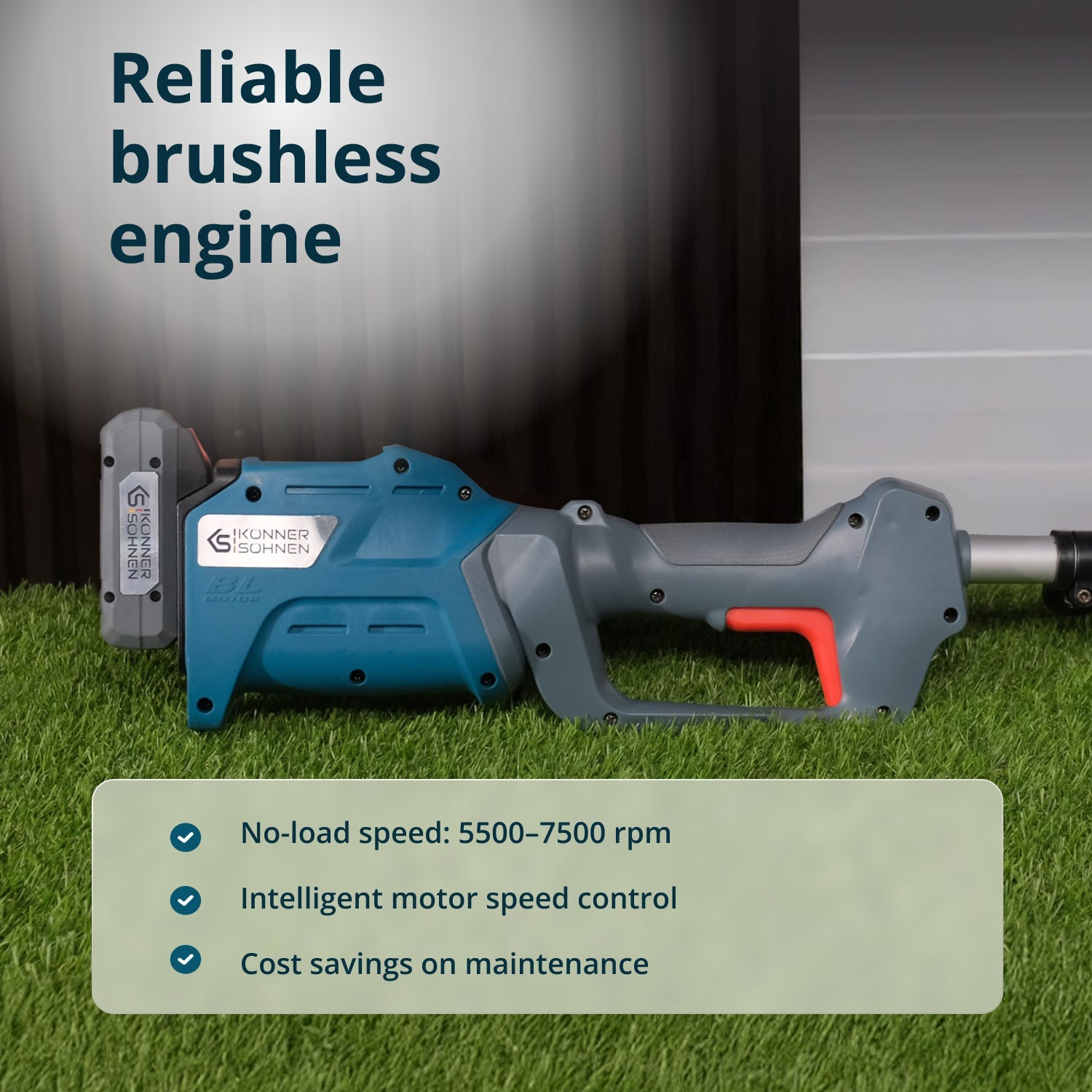 Trimmerele pe acumulator de la Könner & Söhnen® funcționează pe baza bateriilor litiu-ion de 20V, cu o capacitate între 2 și 8 Ah, care se remarcă prin viteza ridicată de încărcare, reducând astfel timpul de pauză.