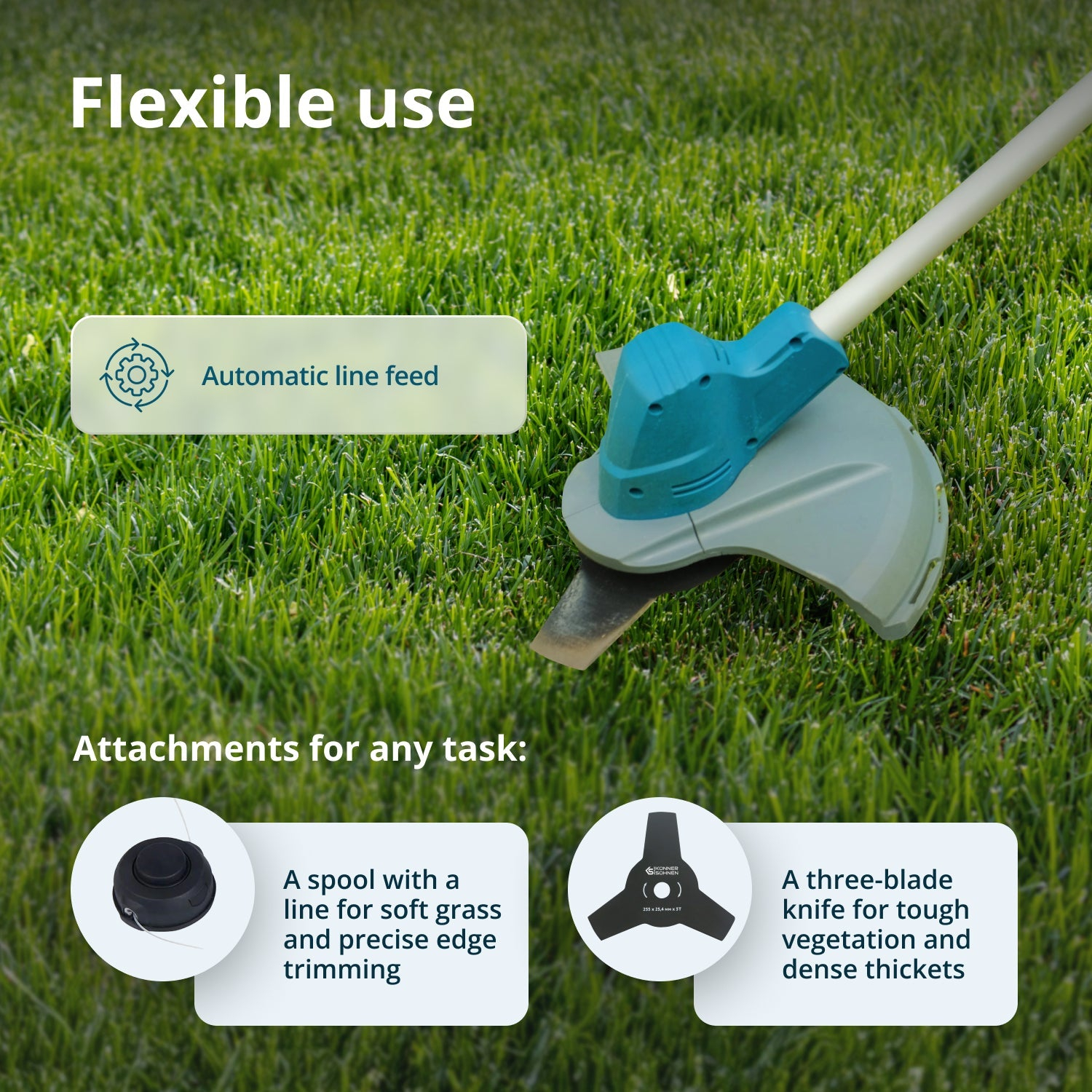 Trimmerele de tuns iarba Könner & Söhnen® răspund diverselor nevoi ale utilizatorilor datorită versatilității lor. Acestea sunt echipate cu două accesorii pentru lucru: un cuțit cu trei lame și o bobină cu fir, fiecare având moduri de lucru specifice. Cuțitul cu trei lame este ideal pentru sarcini mai dificile în spații deschise, fără obstacole, fiind capabil să taie rapid tufișuri dese sau plante cu tulpini groase. Accesoriul cu fir este perfect pentru tunderea vegetației în apropierea obstacolelor, cum ar fi alte plante, copaci, borduri sau garduri, beneficiind de o alimentare automată a firului.