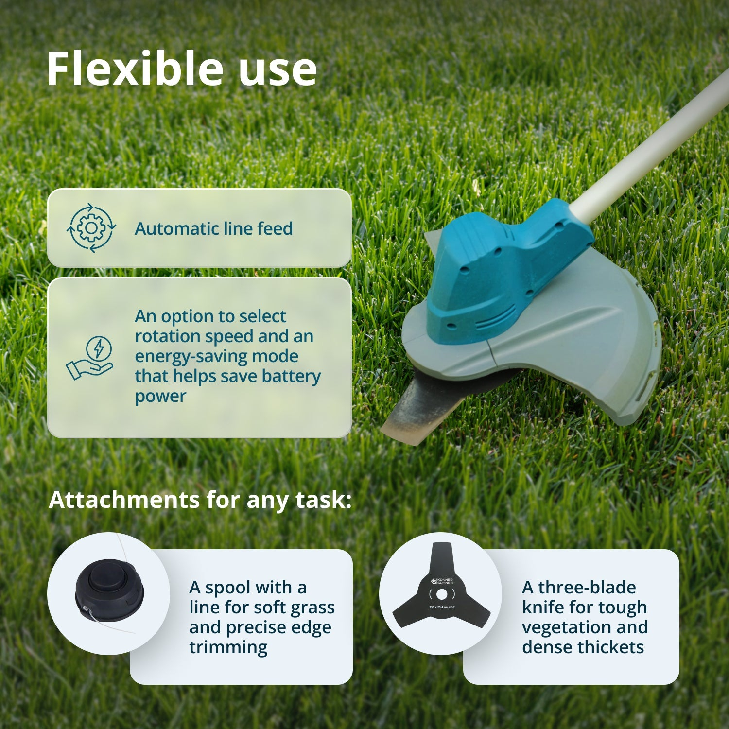 Trimmerele de tuns iarba Könner & Söhnen® răspund diverselor nevoi ale utilizatorilor datorită versatilității lor. Acestea sunt echipate cu două accesorii pentru lucru: un cuțit cu trei lame și o bobină cu fir, fiecare având moduri de lucru specifice. Cuțitul cu trei lame este ideal pentru sarcini mai dificile în spații deschise, fără obstacole, fiind capabil să taie rapid tufișuri dese sau plante cu tulpini groase. Accesoriul cu fir este perfect pentru tunderea vegetației în apropierea obstacolelor, cum ar fi alte plante, copaci, borduri sau garduri, beneficiind de o alimentare automată a firului. KS BCT-40V are opțiunea de selectare a vitezei de rotație și modul de economisire a energiei, care permite economisirea consumului de energie al acumulatorului.