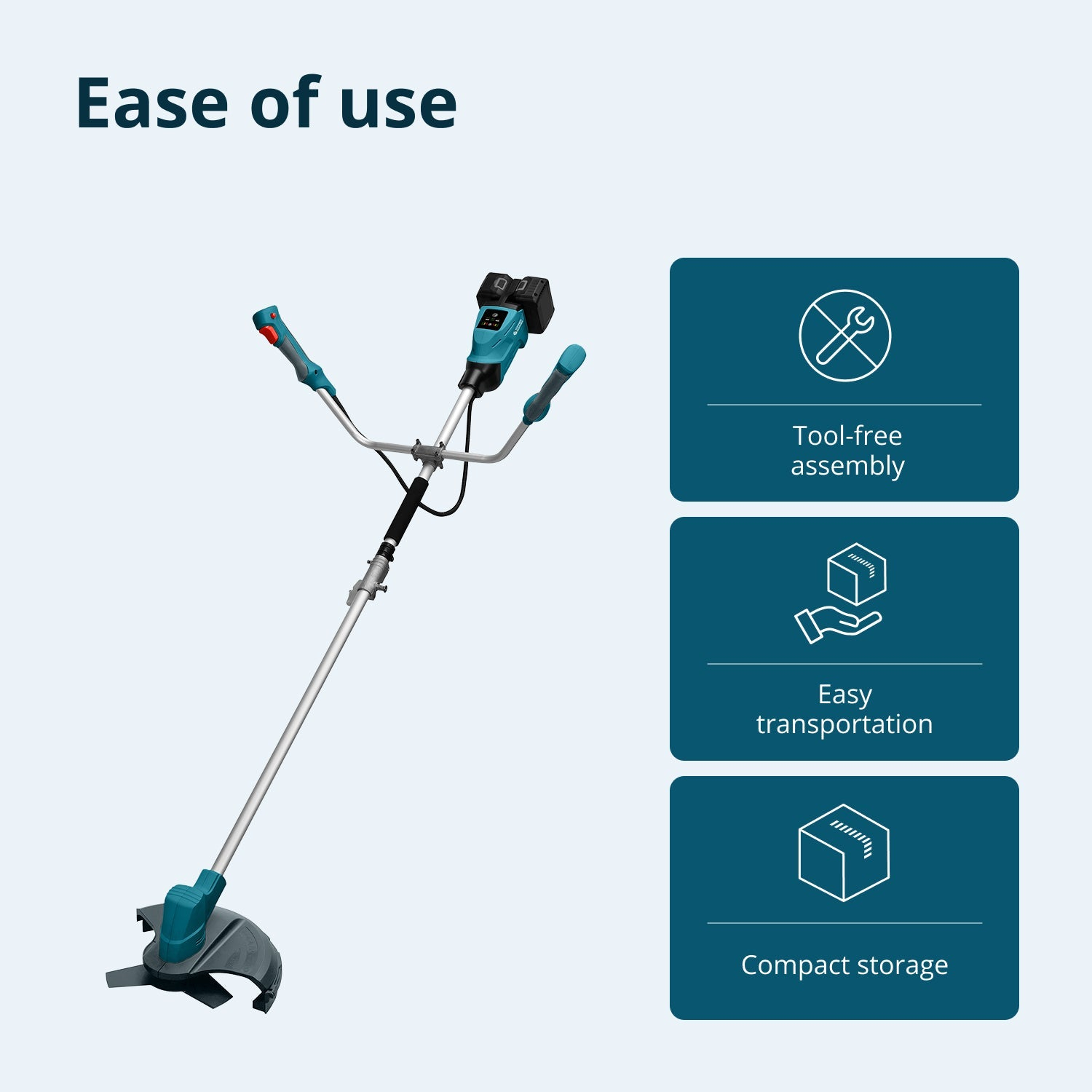 Mânerul trimmerului poate fi reglat la diferite înălțimi, permițând adaptarea acestuia la statura oricărui utilizator. Curea de umăr cu inserție moale ajută la distribuirea echilibrată a greutății, susținând echipamentul fără a afecta sănătatea utilizatorului și reducând efortul asupra mâinilor. În plus, trimmerele se asamblează și se demontează rapid, în doar câteva minute, pentru a facilita transportul și depozitarea compactă. Nu necesită întreținere complexă, datorită absenței amestecurilor de combustibil, filtrelor sau altor componente similare.