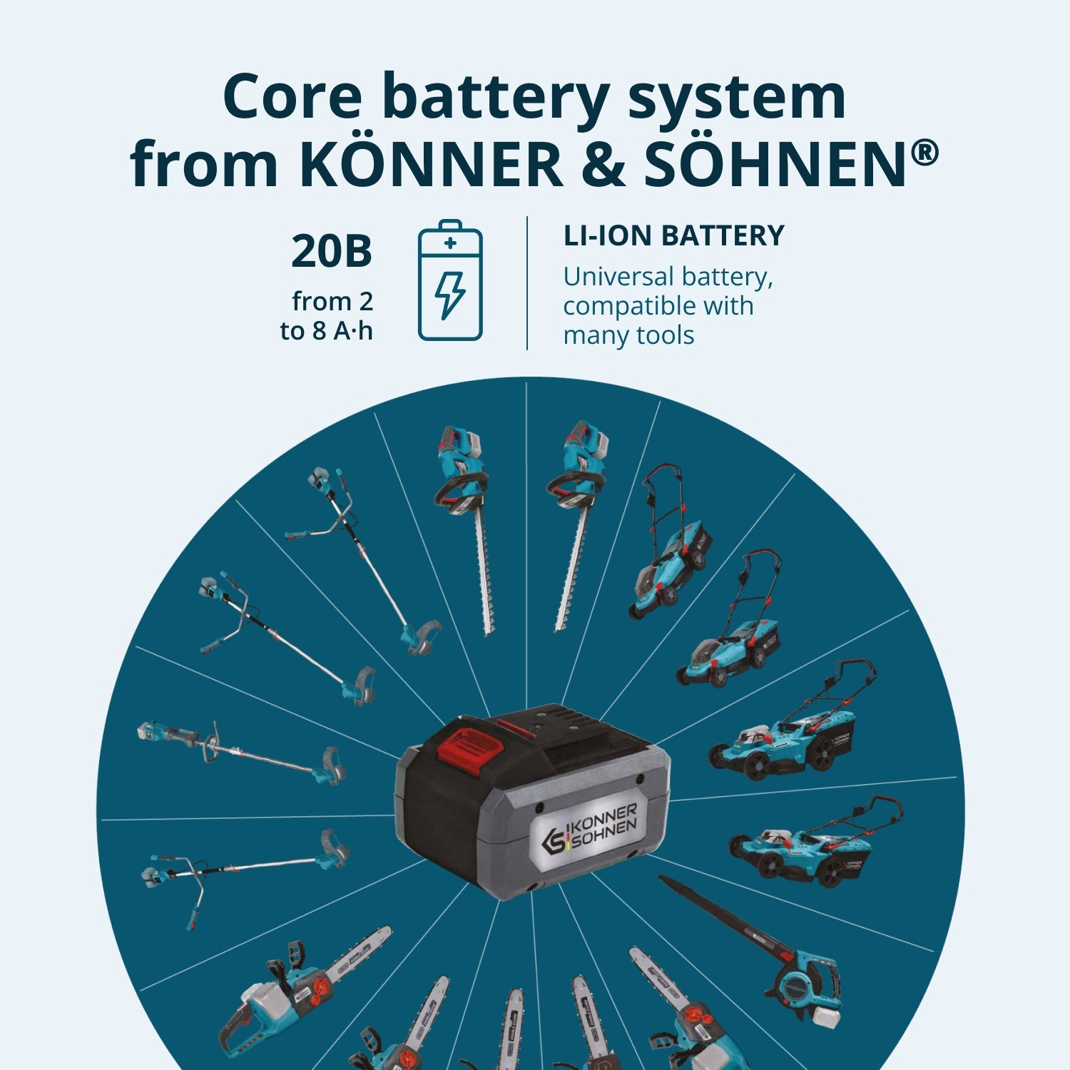 Trimmerele pe acumulator de la Könner & Söhnen® funcționează pe baza bateriilor litiu-ion de 20V/40V, cu o capacitate între 2 și 8 Ah, care se remarcă prin viteza ridicată de încărcare, reducând astfel timpul de pauză.
