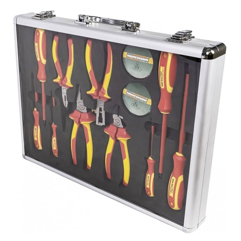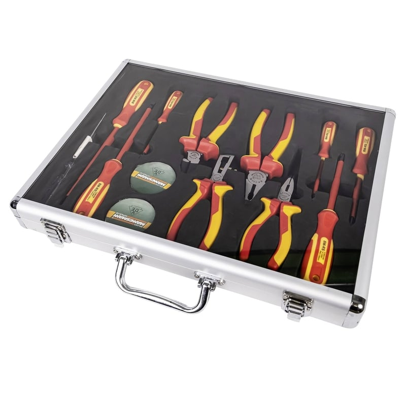- Trusa de electrician ce contine 4 clesti, 6 surubelnite, tester de tensiune si 2 role de banda izolatoare VDE